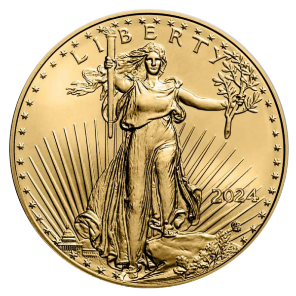 Mit dieser American Eagle Goldmünze wählen Sie eine der bekanntesten Anlagemünzen, die von der U.S. Mint, der offiziellen Prägeanstalt der Vereinigten Staaten von Amerika, erstmals im Jahr 1986 ausgegeben wurde. Die Eagle Goldmünze ist einer der offiziellen Bullion Coins der USA, wobei die Regierung das ordnungsgemäße Gewicht, die Feinheit sowie den Goldgehalt der Münze garantiert. Die American Eagle der U.S. Mint weisen eine Feinheit von 916,7/1.000 Gold auf. Diese Münze, mit dem Nennwert von 10 US-Dollar, gehört zu den echten Anlage-Favoriten. Auf der Vorderseite sehen Sie das ausgeprägte Profil eines Adlers, auf dem seine scharfen Augen und sein spitzer Schnabel markant hervorstechen. Über dem Profil können Sie das offizielle Motto der Vereinigten Staaten „IN GOD WE TRUST“ sowie den lateinischen Wahlspruch „E PLURIBUS UNUM“ lesen, der, ins Deutsche übersetzt, heißt „Aus viel wird eins“. Auf der Rückseite können Sie die Freiheitsgöttin sowie das Prägejahr der Münze „2024“ entdecken. Die USA mit ihren Symbolen des Adlers und der Freiheitsgöttin werden mit dem Begriff der „Freiheit“ assoziiert.
